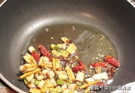 第三步,煎鍋加入少許食油,燒熱,加入蔥、薑、蒜和幹紅辣椒,小火炒出香味,再加入2湯匙豆瓣醬,繼續上用紅油小火炸;