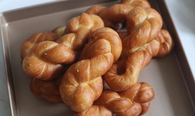 另一面也上色後,就可以取出瀝幹油,放入烤盤中。特別軟好吃的麻花,口感松軟,入口超級爽口,弟弟一口氣吃瞭2個,對著媽媽買瞭幾條街的炸麻花大呼小叫!