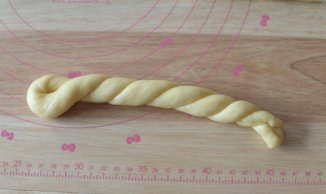 3、松弛結束後,將面團揉成長條。揉的時候要註意沿著面團的膝蓋。如果它跪著回來,說明它需要休息一會兒。不要用力揉,那樣會把面團弄破。完成的扭曲看起來不太好。也可以搓到大概的長度,把膠條松一會,這樣再搓的時候,會發現很容易撐開,不會縮回。
