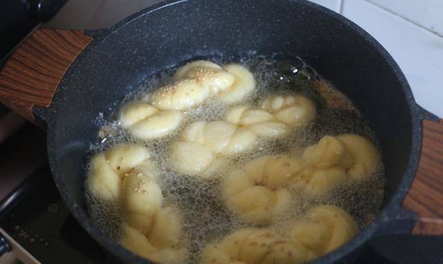8、鍋中油燒開,約7分鐘後,開始在鍋中炸發酵好的麻花。如果不知道油溫,可以放一小塊面團。如果面團周圍有小氣泡,可以立即煮熟。