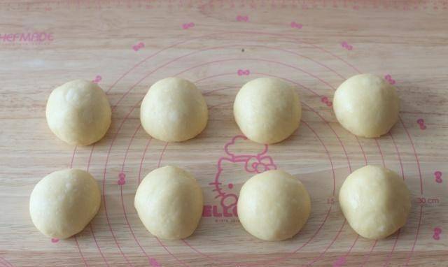 2.取出面團,分成8等份,每份78克,蓋上保鮮膜防止面團變幹,靜置約10至15分鐘。我覺得這個尺寸很合適。您可以根據需要將其變大或變小。