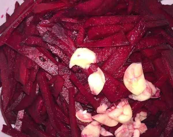 這時候我們就可以炒菜瞭。鍋中倒入少許橄欖油。當油溫達到60%時,加入蒜粒。香氣激發後,將甜菜根放入鍋中,加鹽。加入雞精翻炒至入味,即可裝盤。