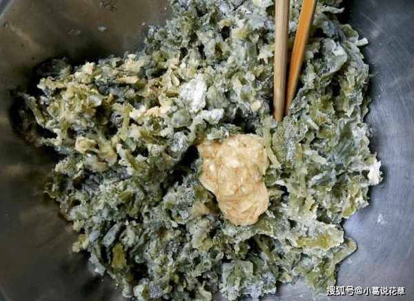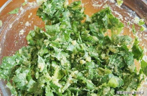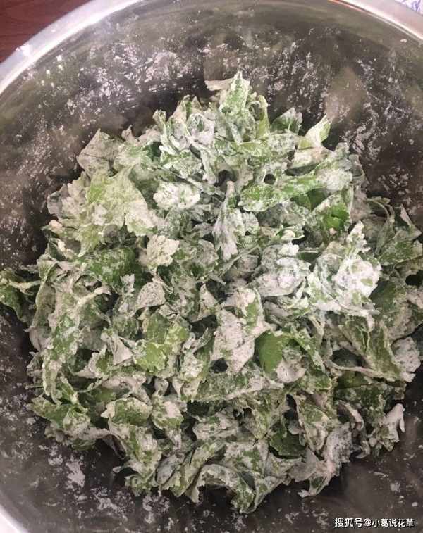 2、這時候把面粉撒在芹菜葉上,快速攪拌,把所有的材料混合在一起。