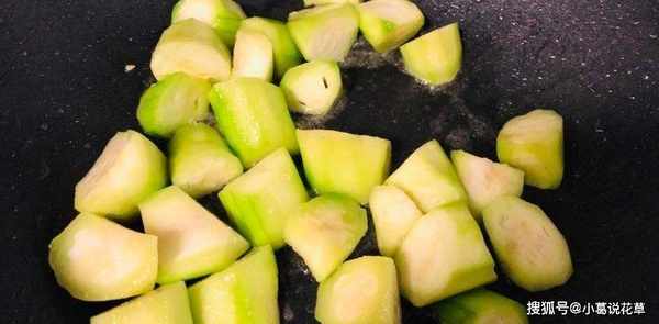 3、隨即在燒熱的鍋中倒入適量的食用油,先將絲瓜放入鍋中,快速翻炒,然後倒入適量的水。