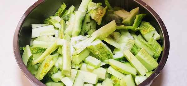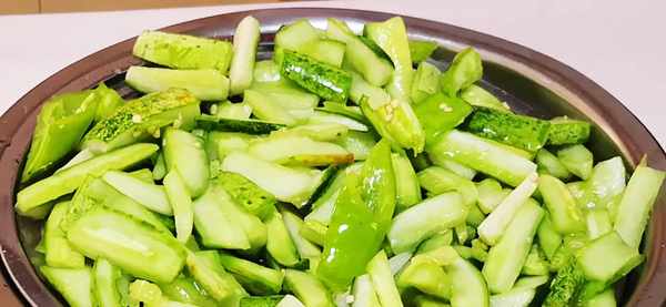 1、將菜園裡摘回傢的黃瓜,清洗幹凈,去頭去尾,再切成四半,把老一點的黃瓜瓤去掉,(老一點的瓤做出來有一點酸)。美的瓤也可以留著,按個人喜歡的來做哈!然後把黃瓜切成條,再切成片,洗凈的青尖椒也切成段,一起放入碗中;將黃瓜片裡放入一點鹽,拌勻,醃制2個小時左右,這樣做出的黃瓜脆爽入味還好吃。
