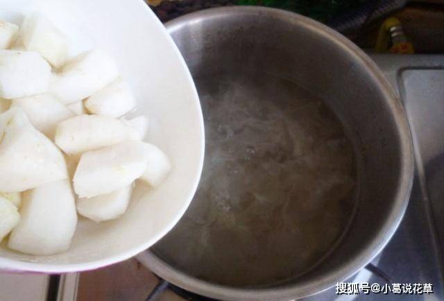 第四步:荸薺切好後,白菇還沒有煮熟,需要在碗裡泡水,防止荸薺氧化變黃。白蘑菇煮軟後,將切好的栗子放入鍋中一起煮片刻,然後加入一些羽扇豆,如果白蘑菇煮到阿膠出來就更有營養瞭,加入冰糖和攪拌均勻,這碗湯就差不多好瞭。