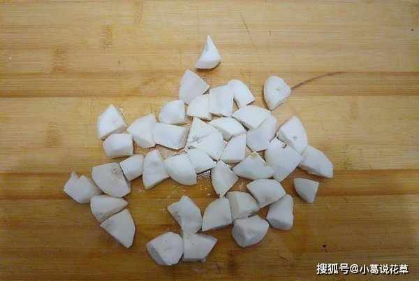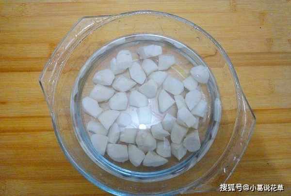 第三步:泡好後,將荸薺撈出,再次沖洗幹凈!然後用刀把菱角的外皮剝掉。荸薺去皮時,別忘瞭將發黃的部分清洗幹凈,以免影響口感。去皮後,將荸薺切成小塊,方便烹調。