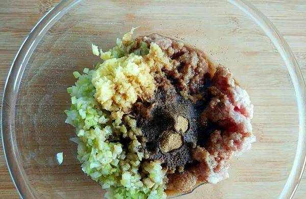 2.炒鍋燒熱放入食用油,油熱後把準備好的蔥薑放進去炸幹炸香。炸香之後撈出來,把這個熱油直接澆在肉餡上面就可以啦。然後在裡面加入精鹽、十三香、蠔油、生抽、老抽調味。用筷子直接攪勻放置一旁備用。