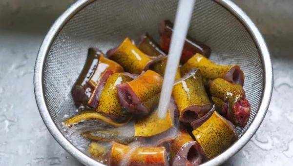 2.買回傢的黃鱔給它切成小段,然後在表面改上一字花刀。這樣更容易入味。放在清水中給它多沖洗兩遍洗掉表面的血水。洗幹凈之後,控水備用。