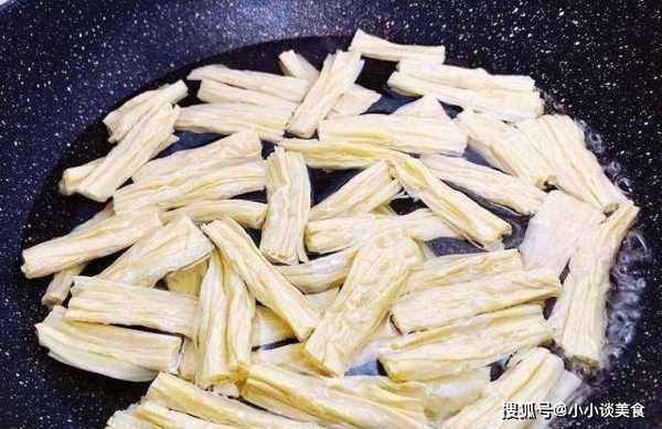 鍋中加入適量的水。大火燒開後,將豆腐條放入水中稍燙片刻,撈出,沖涼瀝幹備用。然後水繼續燒開,將黑菇放入水中焯一下,撈出瀝幹備用。然後把焯過水的腐竹和黑蘑菇放在碗裡備用。