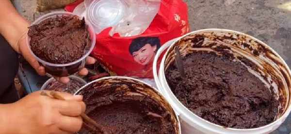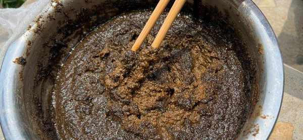 這時候面醬就初步制作完成瞭,但是還需要很長時間的發酵,才能讓麥香味更好地激發出來。如下圖,把面醬放在室外,上面蓋上細紗網,利用陽光照射,讓面醬顏色變黑,每天要用筷子攪動幾次,這樣上色均勻。