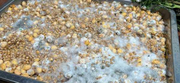這個過程大約10天-15天左右,具體根據成色,剛開始到第3天的時候麥子上會長一層白色的毛,這是發酵的作用導致的。我是放在廚房外面的儲物間裡發酵的,白天的溫度和室外差不多,所以發酵很快。