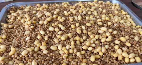 第二步:煮麥,把洗凈的小麥和黃豆放水中浸泡2個小時,小麥和黃豆的比例大約3:1,分別上鍋蒸熟或者煮熟都可以。我是煮熟的,大約煮瞭30分鐘,不要把豆子煮到軟爛開花,那樣就影響發酵瞭。煮到如下圖這樣就可以。