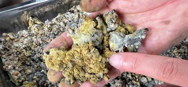 發酵到第7天的時候,白色會變成黃色,直到第12天的時候變成黃綠色的毛。如下圖所示,這時候發酵就完成瞭。切記在整個發酵的過程中要用艾草把豆子嚴密地蓋起來,不要沾生水!