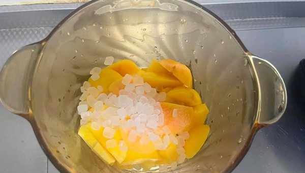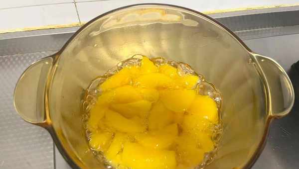 3、鍋裡加入適量的,純凈水把黃桃放進去,加入綿白糖和冰糖,大火煮八分鐘,晾涼即可食用,