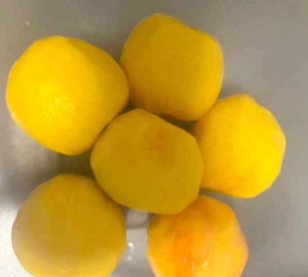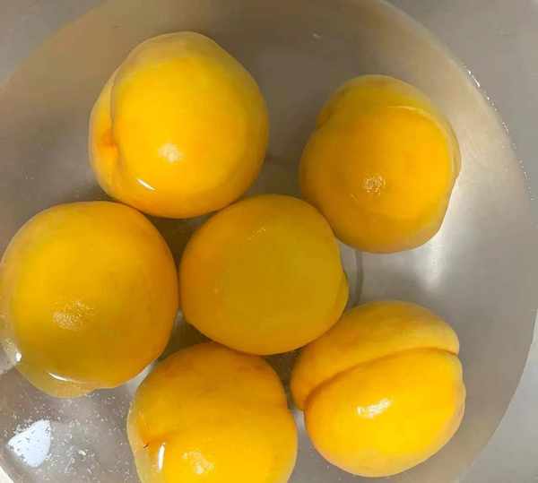 1、把買來的黃桃洗凈,要註意,黃桃有毛會對皮膚產生瘙癢,盡量加食鹽泡20分鐘,然後再洗幹凈去掉皮備用