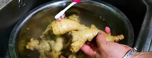 拿出一塊生薑,先把生薑用水淋濕,再往生薑上倒入一勺鹽,因為生薑表面上有很多的泥土和雜質,從鹽來搓洗可以起到消陷害菌的作用,鹽的顆粒感還可以增加摩擦力,這樣可以將生薑洗的更幹凈。用手搓洗一遍之後,就用流動的清水沖洗幹凈,這樣生薑就洗幹凈瞭。有些朋友喜歡將生薑的皮削掉,最好不要去掉它的皮哦,因為生薑的皮屬於熱性,而它的肉屬於涼性,帶著皮一起煮才是中性,也就是說起到一個中和的作用。