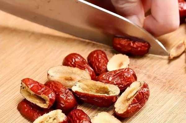 接著再來切紅棗,把紅棗放到案板上,一樣的 用刀切成薄片,由於紅棗比較小不好拿,切的時候大傢要小心一些,不要切到自己的手瞭,接下的棗肉留在案板上備用,而棗核就可以丟掉不用瞭。