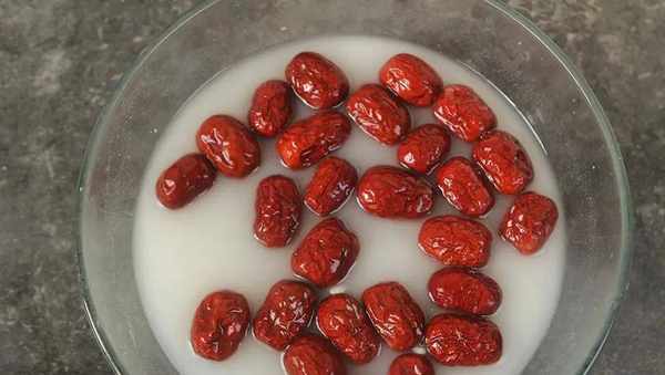 這裡可以準備五六顆紅棗,把紅棗放入盆裡,加入適量的清水,再來一勺面粉,面粉具有較強的吸附性,可以把紅棗褶皺裡面的灰塵吸出來,這樣就可以清洗幹凈瞭。加入面粉之後先讓紅棗在裡面浸泡幾分鐘,然後再將紅棗搓洗一點,洗過一遍之後把臟水倒掉,加入清水再洗一遍,這樣就很幹凈瞭,最後撈出來放到碗裡備用。