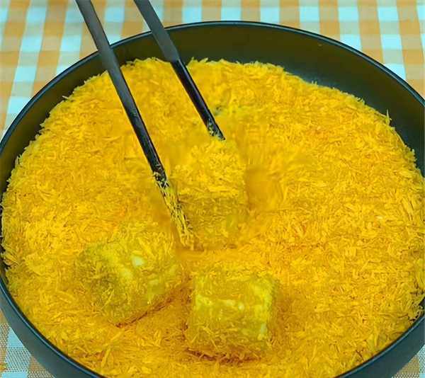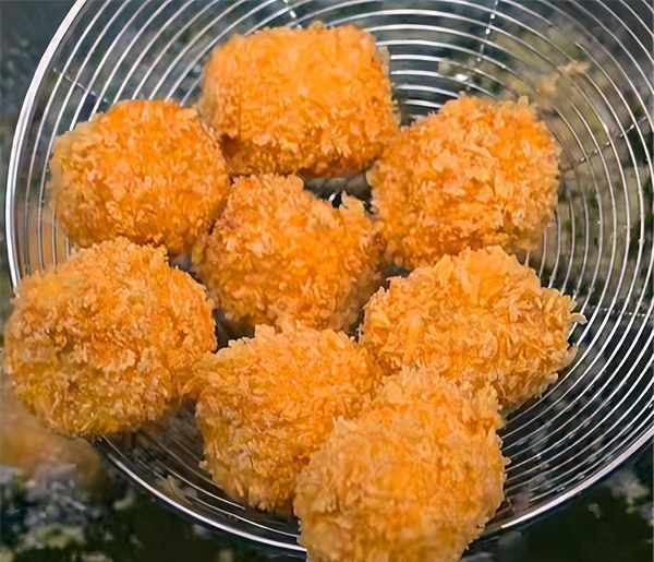 鍋中燒油,等油溫有六成熱的時候放進去,炸到顏色金黃就可以瞭,時間大概在一分鐘左右就可以瞭,要是不知道六成熱是什麼時候,就把筷子放進去,看到有小氣泡就可以放進去油炸瞭。