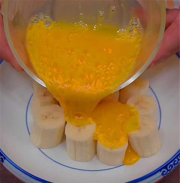 首先我們要將香蕉去皮切成小塊,碗中打入雞蛋攪拌均勻後均勻的澆在切好的香蕉上。