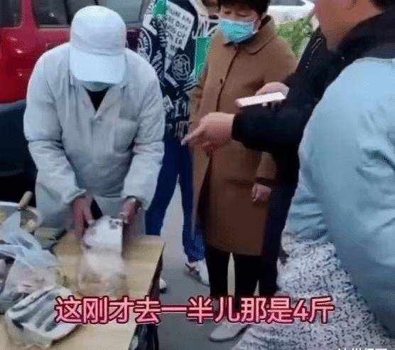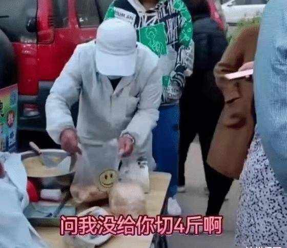 這時大爺就問男子是不是要這樣切,男子也沒有想那麼多,就回應瞭大爺就按照他說的切,因為他覺得事先已經說好是要一斤,大爺是知道的,也就想著切下去應該就是一斤左右,可是沒有想到這一刀下去竟然是4斤。