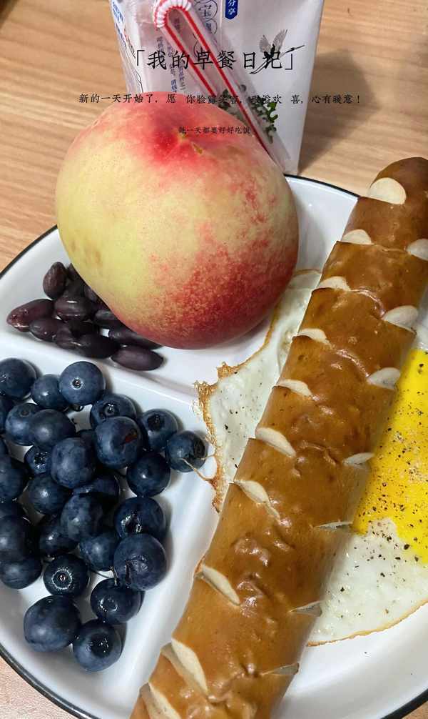 桃子一個、藍莓一份、黑花生10顆、荷包蛋一個、堿水包一個、牛奶一盒。