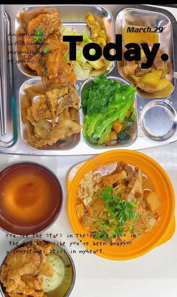 食堂用餐:土豆牛肉、清炒苦瓜、紅燒魚、成都冒菜、醬爆雞丁、酥炸蘑菇、菜饅頭、圓白菜、蒸茄子、油麥菜、綠豆湯一碗。