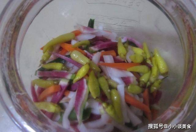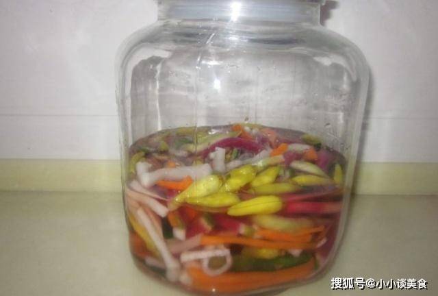 Step3當所有需要的材料都準備好後,放入碗中,加入適量的鹽,用手將鹽攪拌均勻,然後將蘿卜和黃瓜擱置一會。醃50分鐘左右,醃好倒掉多餘的水。然後準備一鍋清水,將花椒、薑片、八角放入水中,大火燒開,水開後撈出多餘的調味料,放涼備用。第四步:把泡好的泡菜去掉多餘的水分,然後壓扁放入泡菜缸中,然後在缸中放入一些泡椒和糖,將曬幹的調味水倒入缸中,水盡量放少許,制作確保蔬菜沒有被覆蓋,這樣味道更好。收好所有香料後,蓋上蓋子醃制3-4天!