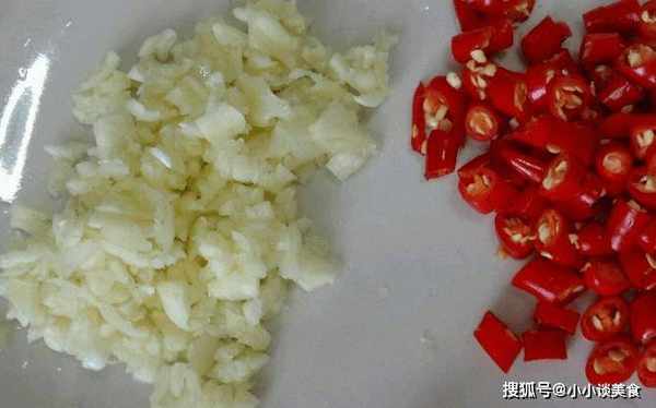 3、緊接著,我們將準備好的小米椒和大蒜進行處理,洗凈,切成顆粒狀,放入碗中。