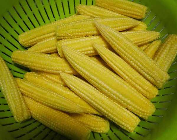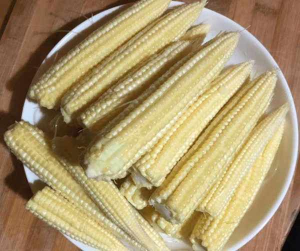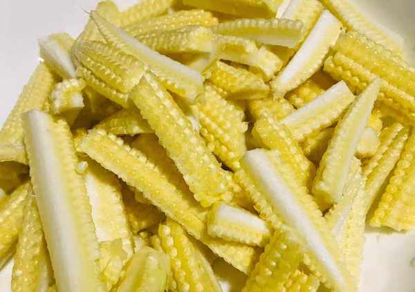 2、接下來處理小玉米,洗凈,對半切開,切成片,放入沸水中撈出。