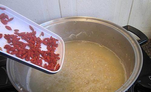 3、將做好的枸杞用清水洗凈。鍋中的小米煮熟後,關火,打開鍋蓋,將黃冰糖和枸杞一起放入,再次蓋上蓋子,利用鍋內的餘熱將黃冰糖融化即可可以把它從鍋裡拿出來。