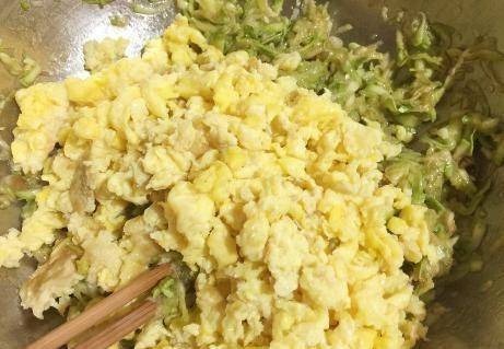 第三步加入蝦皮翻炒出香味。讓這兩個人冷靜下來。西葫蘆醃好後,擠出水分,放入碗中。加入蝦皮和雞蛋,用鹽和胡椒調味。調味,拌勻,餡料就做好瞭;