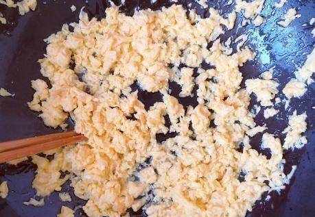第二步,將雞蛋打入幹凈的小碗中,加入少許料酒打散,鍋中加入適量的食用油,倒入蛋液,炸散。盛出;
