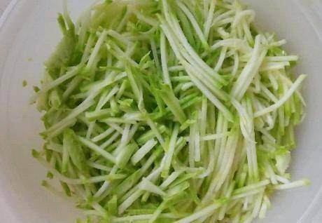 制作過程:第一步,西葫蘆根部切掉後,清洗幹凈,然後用鋼絲刨絲器磨成細絲,放入大碗中,加少許鹽拌勻。讓它醃制。一段時間;