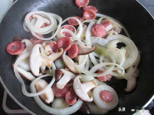 第三步:鍋裏放入橄欖油,放入洋葱,香菇,牛肉腸煎熟,撒上黑胡椒和鹽調味。