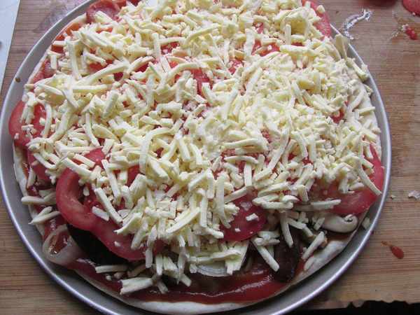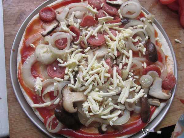 餡料:牛肉小香腸,洋葱,香菇,蕃茄,黑胡椒粉,橄欖油,鹽,番茄沙司,馬利蘇拉起司。
