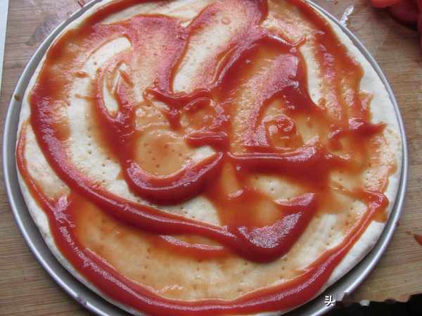 第四步:餅皮放到烤箱200度烤5分鐘,拿出抹上番茄醬,番茄醬的多少可以隨孩子的喜好來决定。