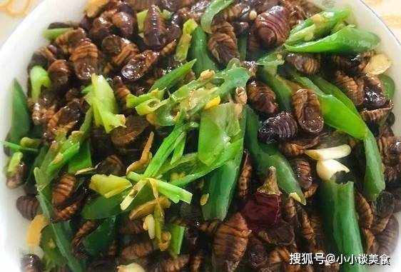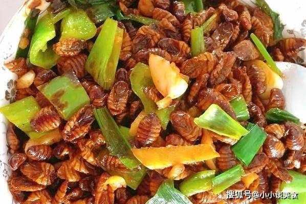 青椒炒蠶蛹。在做這道菜之前,先準備好主料:青椒適量、蠶蛹適量、鹽適量、生薑少許、雞精少許、橄欖油適量。青椒洗凈切條備用,然後將蠶蛹洗凈備用瀝幹備用,生薑洗凈切丁。