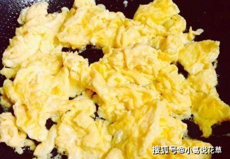 第四步,準備好所有的食材,開始做菜。鍋中加入煎炸油,燒熱,倒入雞蛋煎至成型,用鍋鏟切成塊,先放好,再放回鍋中;