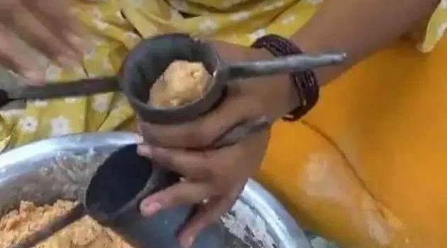 將油燒開,然後將面團撕成小塊,放入小型面條機中。