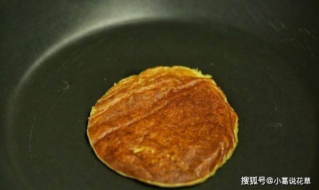 第六步:用小火加熱,等薄餅的一側出現小氣孔,然後用扁抹刀輕輕掀起松餅的一小邊,看靠近鍋底的邊緣是否轉動。金黃色。達到金黃色外觀後,松餅表面會變幹,不會粘鍋。