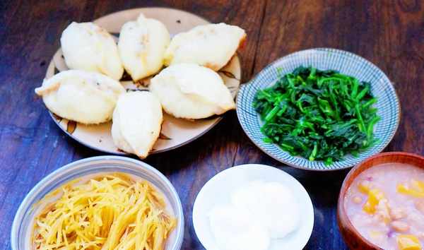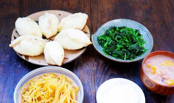 今天早餐:豬肉大蔥水煎包、涼拌土豆絲、涼拌菠菜、蒸荷包蛋、雜糧紅薯粥