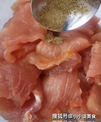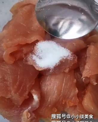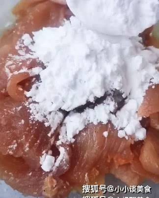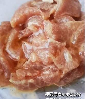 3.醃制裡脊肉。肉片中交替加入少量鹽、生抽、料酒、胡椒粉,然後打入一個雞蛋,取裡面的蛋清。加入淀粉,食用油。然後翻炒均勻再醃半小時。