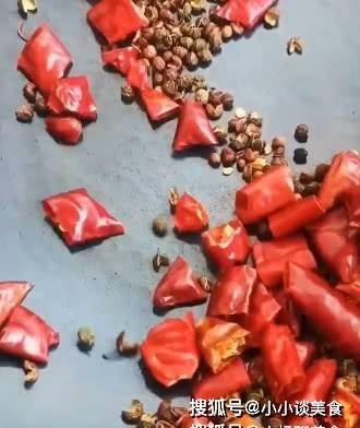 5、接下來就是準備調料瞭。先將適量的花椒、花椒、幹辣椒放入鍋中,用大火炒至辣味出來,盛入碗中待用。