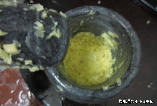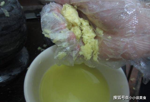 第二步:準備一個石磨,將切碎的生薑放入石磨中,用力磨出汁來。磨好後取汁倒入碗中,用手擠幹剩餘的薑汁。榨完後,剩下的薑可以放在一邊,不要扔掉,因為剩下的薑還可以用來炒菜。生薑處理好後,放在一邊備用。