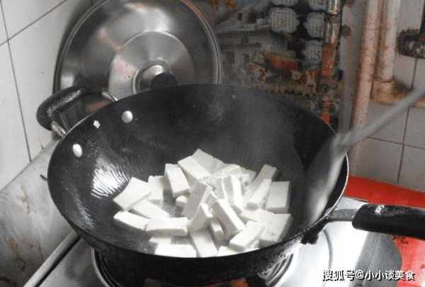 第三步:蓋上豆腐後,取出放在一邊瀝幹水分。待所有食材處理完畢,取出準備好的鍋,用大火將鍋烘幹。鍋幹後,加入適量的油。當油加熱到70%到80%熱時,加入瀝幹的豆腐塊。放入適量的醬油和蠔油。