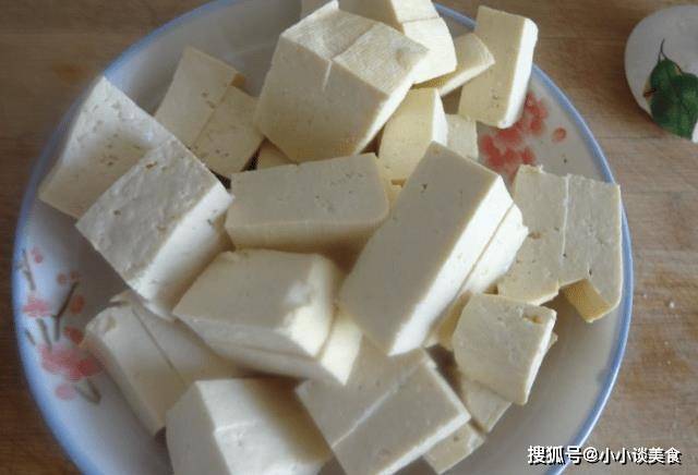 第二步:將準備好的豆腐用清水洗凈,用刀將豆腐切成小塊,放入盆中,倒入適量的水再加入少許鹽,用微咸水將豆腐洗凈浸泡。大約10分鐘,這樣可以去除豆腥味,讓豆腐更好吃。