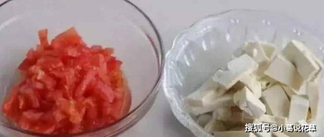 第一步,我們準備好所有的材料,在番茄上劃個“十字”,用熱水燙一下,去皮切塊裝盤待用。然後豆腐切條,火腿切條,金針菇撕洗幹凈裝盤。