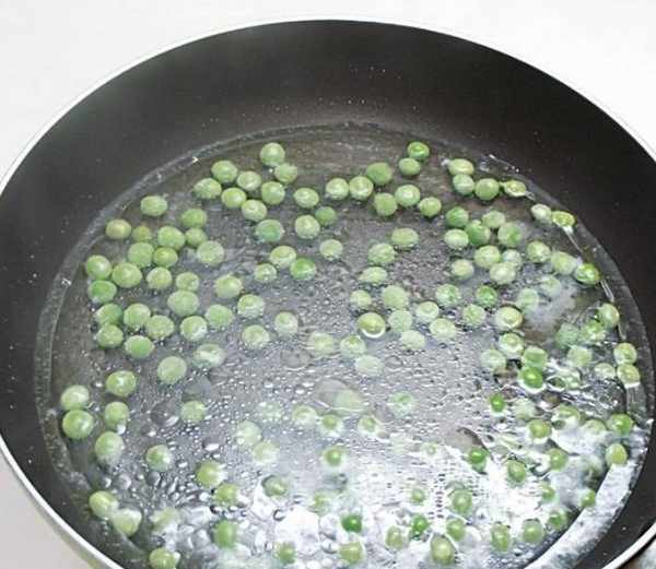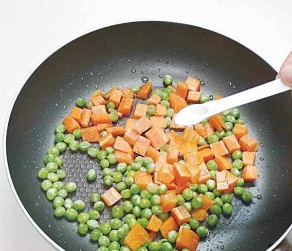 3.炒鍋內放油燒熱,放胡蘿卜及豌豆翻炒均勻,加鹽炒入味。